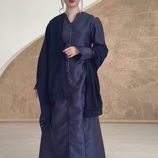 The Alaia Dress & Shawl Set in Midnight is the epitome of evening elegance. Crafted from luxurious shantung crepe, this long navy dress is designed to make a statement with its flounce sleeves and delicate ladder lace trim. Side panels from the waist down gracefully contour the silhouette, creating an elongated, flattering look. Whether for an intimate gathering or a grand celebration, this set exudes timeless sophistication. The matching lace-trimmed shawl adds a soft, flowing layer, completing a look of effortless grace and charm.