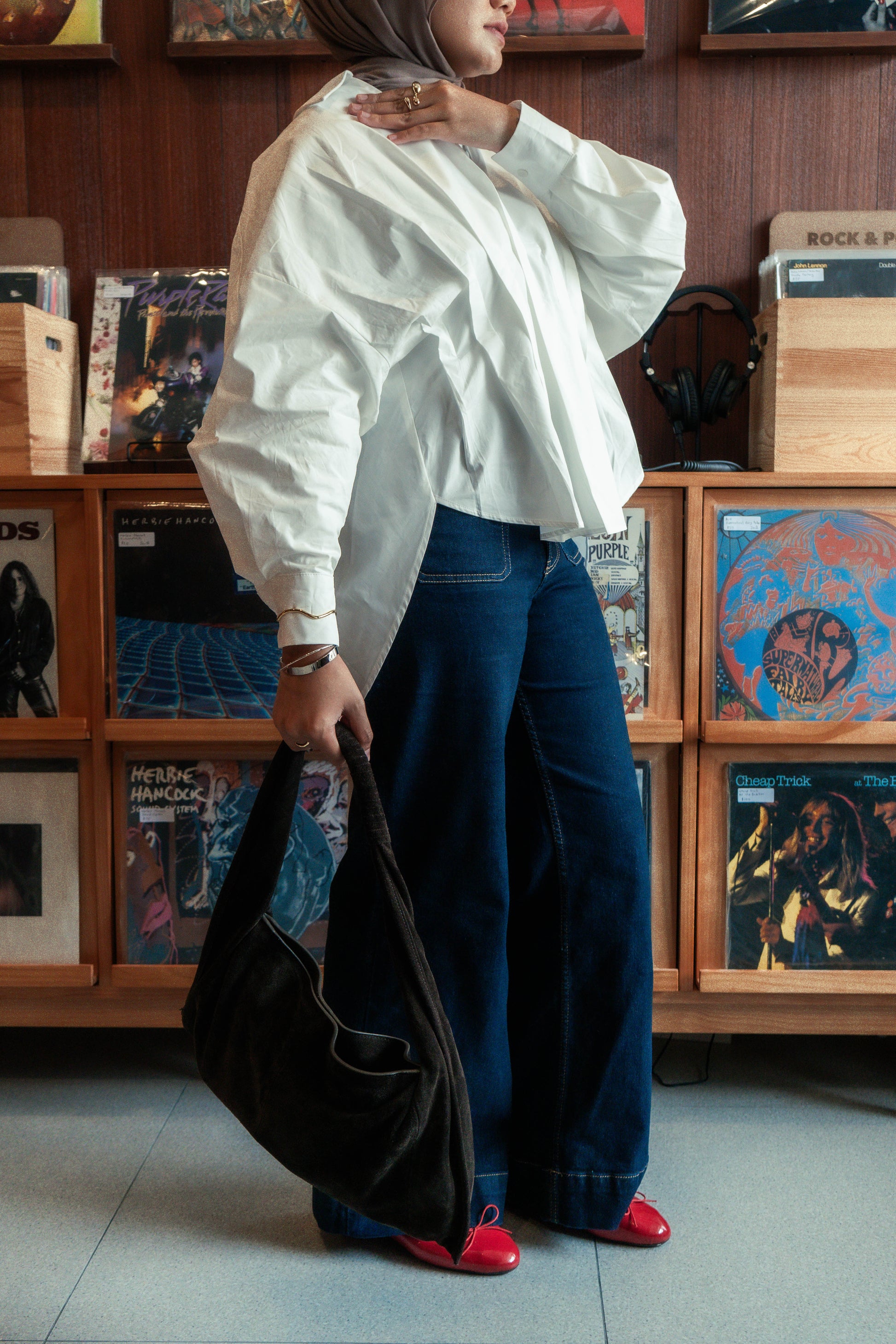 An oversized cotton poplin shirt with structured front pleats for a defined yet relaxed fit. Finished with a deep V-placket and dropped shoulders, it balances polish and ease. Available in Chantilly and Raven.