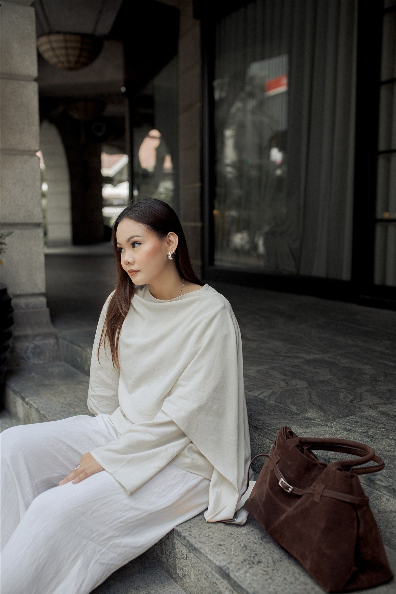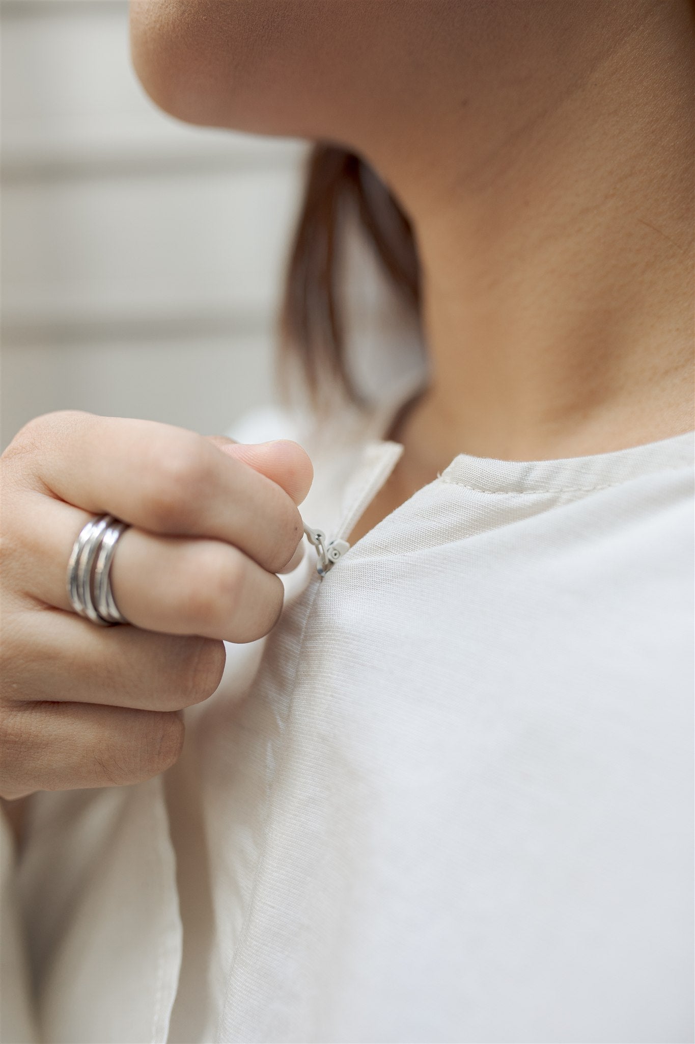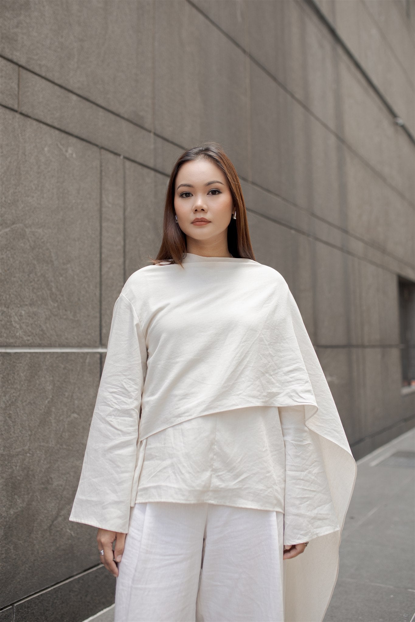 A discreet front zip is concealed beneath the drape for seamless nursing access, while a subtle snap button at the shoulder secures the overlay in place, maintaining coverage without disrupting the clean lines. Finished with wide sleeves and a relaxed, modest fit. Perfect for a relaxed, modern and elevated look.