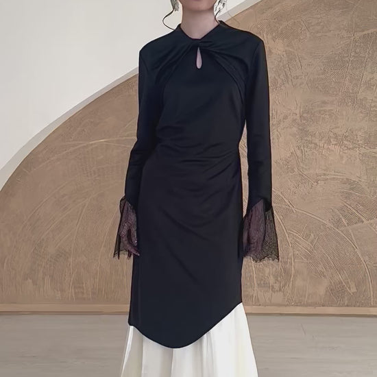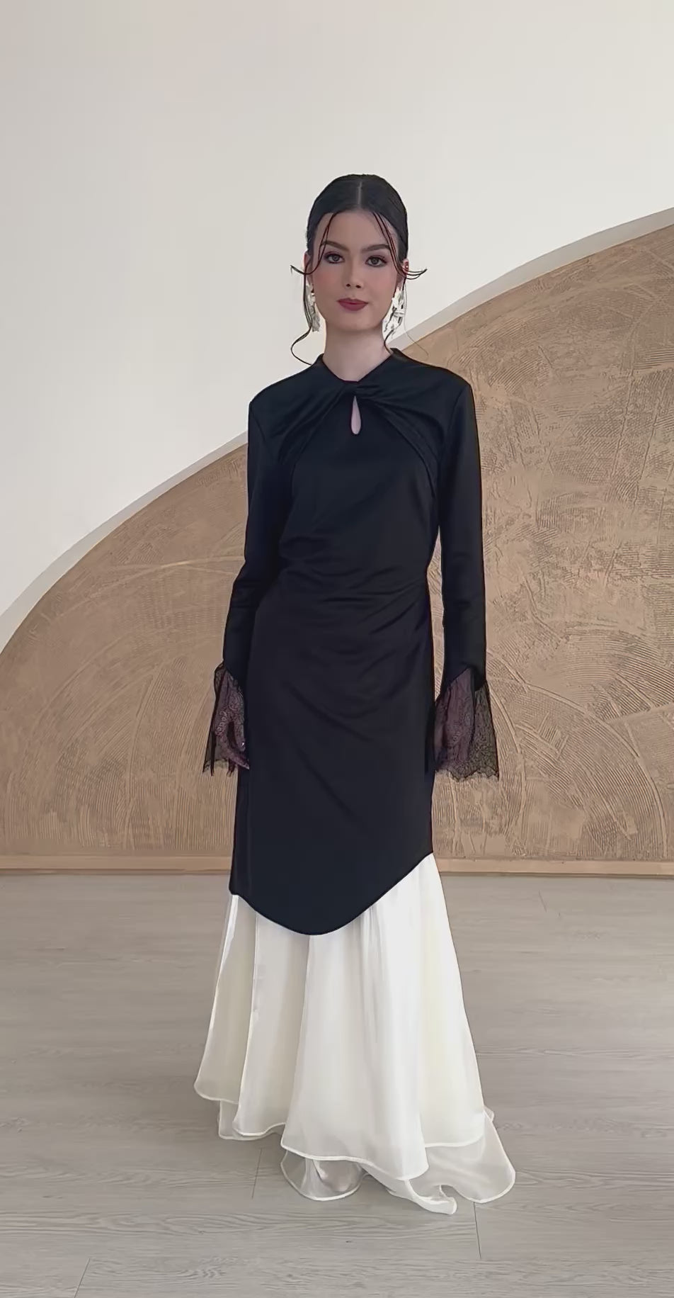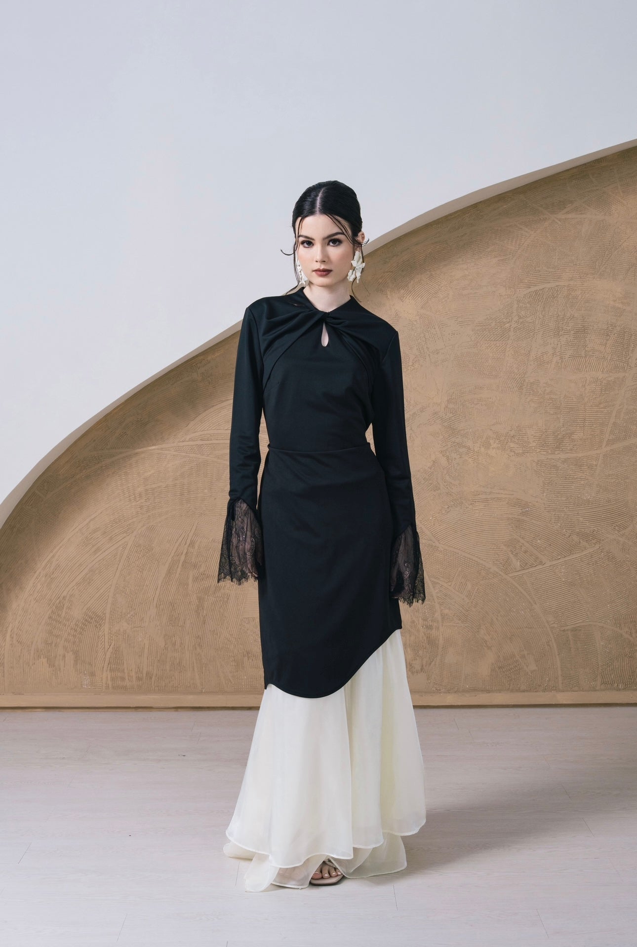 The first of our signature monochrome Raya pieces, the Maysa Modern Kurung Set in Noir embodies timeless elegance. The black top features a graceful asymmetrical hem and a twist-knot neckline, complemented by delicate chantilly lace sleeves that add a feminine touch. Paired with an ethereal off-white organza skirt, this set exudes sophistication and modern charm. The removable tie-back waist sash offers versatility, allowing you to customize the fit for every occasion. A perfect choice for making a statement this Eid.