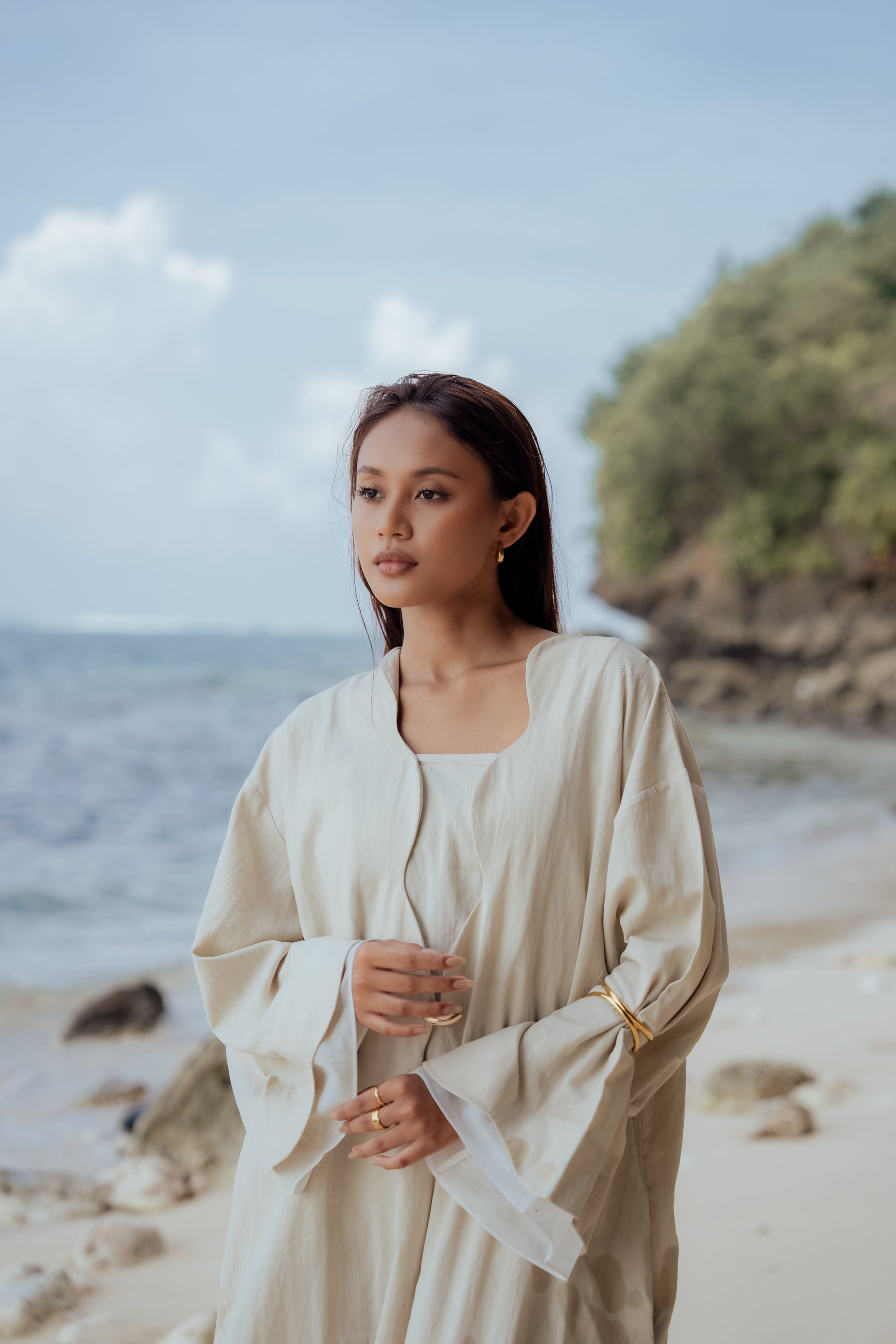 • Long sleeves with contrast linen hem