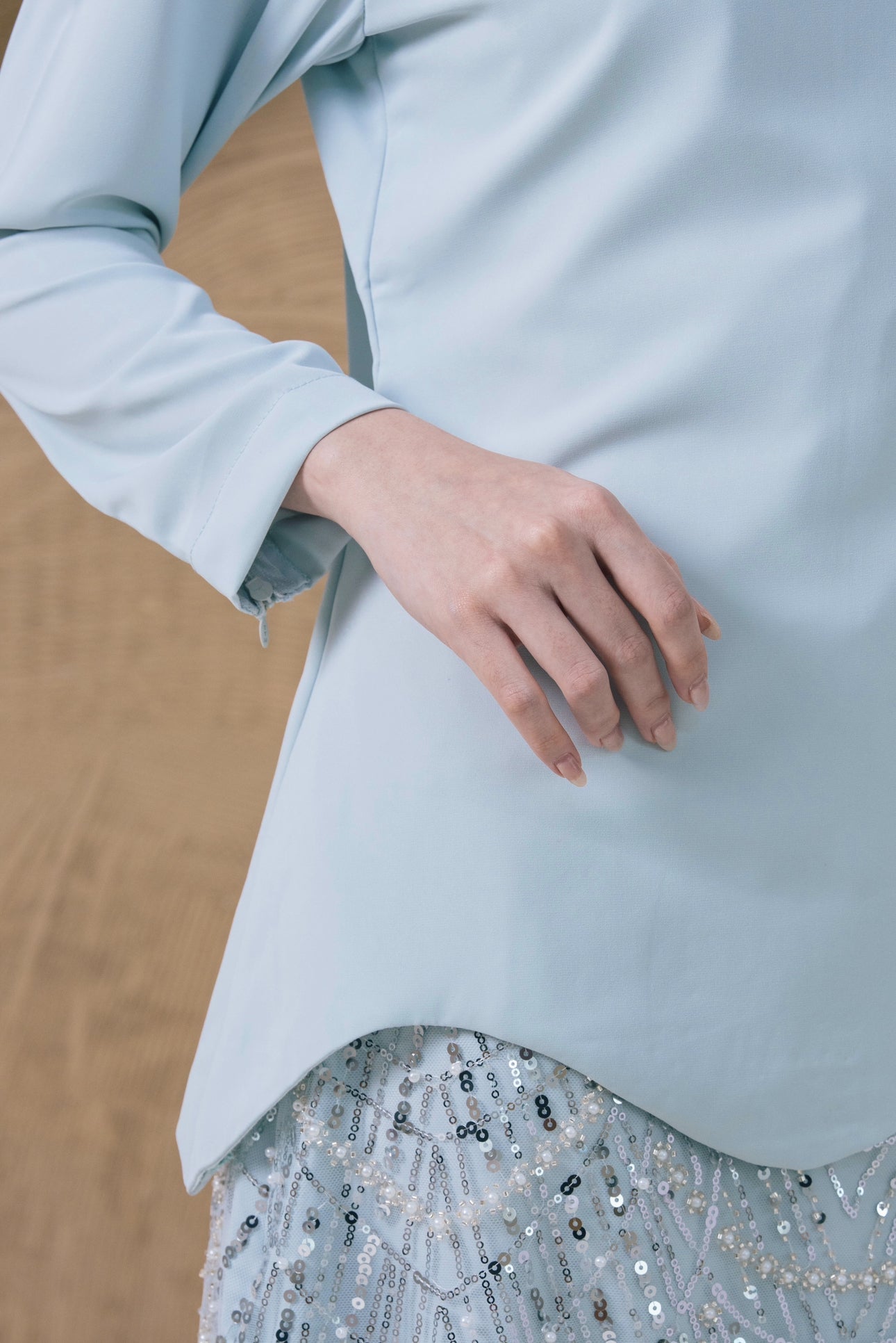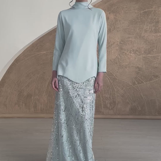 Soft and dreamy, the Soraya Embellished Kurung Set in Silver Sage Lattice is a three-piece ensemble that embodies understated beauty. The top features a wavy hem that flows effortlessly, adding a graceful touch to the design. The A-line skirt is adorned with intricate embellishments, bringing a refined yet playful charm to the set. Choose between two stunning skirt designs—the geometric Lattice or the delicate Flora—each offering its own unique allure. The matching neck sash ties the look together, creating a polished and elegant finish.