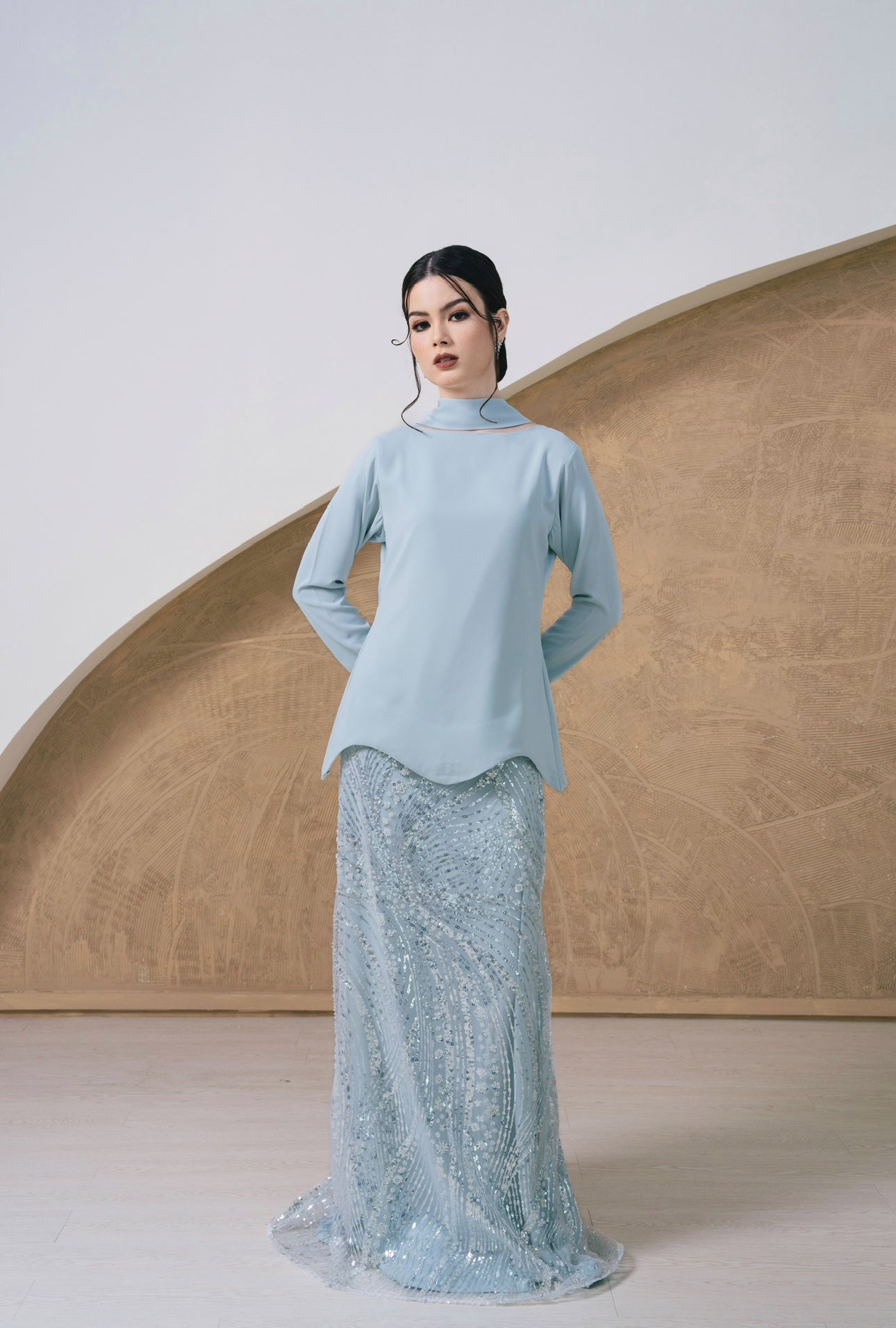 Soft and dreamy, the Soraya Embellished Kurung Set in Silver Sage Flora is a three-piece ensemble that embodies understated beauty. The top features a wavy hem that flows effortlessly, adding a graceful touch to the design. The A-line skirt is adorned with intricate embellishments, bringing a refined yet playful charm to the set. Choose between two stunning skirt designs—the geometric Lattice or the delicate Flora—each offering its own unique allure. The matching neck sash ties the look together, creating a polished and elegant finish.
